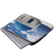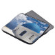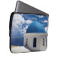 Laptop sleeve with Santorini, Greece photo with blue sky and white clouds.