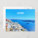 View from Santorini, Greece showing hillside of buildings, islands, boats, ocean.