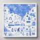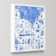 Blue and white watercolor painting of Oia on the Greek Island of Santorini in the Mediterranean. Original art by Nic Squirrell.
