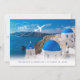 Save the Date postcard for a Santorini, Greece Destination Wedding featuring the classic blue and white dome buildings skyline and shoreline with a fun travel theme destination wedding monogram inside an airplane heart trail logo.