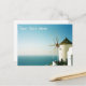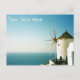 Watercolour-style image of a windmill on the edge of the caldera in Oia, on the Greek island of Santorini