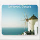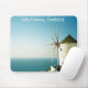 Watercolour-style image of a windmill on the edge of the caldera in Oia, on the Greek island of Santorini