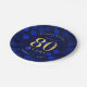 Chic 80th Birthday paper plate featuring the words "Cheers to 80 Years" in faux gold foil against a sapphire blue bokeh lights pattern background.