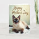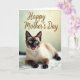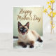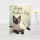This card features a close-up of a colorpoint cat with sapphire-blue eyes that seem to linger on you with a gentle, affectionate look ❤️. Its face has a deep chocolate-brown mask against creamy fur, while the rest of its body softens out of focus behind it for a cozy, intimate feel. A tiny pink tongue peeks out, giving the expression a friendly, slightly teasing charm like a quiet inside joke. Soft, diffused light warms the scene, as the cat rests on a polished, lightly veined marble surface that adds a touch of elegance. Across the upper area, a glittery golden-brown message stretches in flowing lettering, standing out clearly without covering the cat’s eyes. The background fades from a muted pale green on the left into a warm, light cream on the right, with a smooth gradient that keeps the mood calm and affectionate 🌼. The marble beneath the cat shows faint gray veining and a gentle sheen near the lower edge.