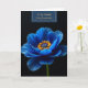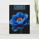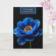 Designed with a dramatic, inky-black background, this card centers on a large blue flower whose petals open in layered shades of azure and deep sapphire. A focused beam of light grazes the ruffled edges, giving the bloom a soft glow that feels like a quiet, affectionate moment ❤️. In the middle, a cluster of golden-orange stamens shines warmly, like a gentle spark between close companions. Above the flower, a deep blue rectangular panel hangs near the top, creating a calm space for the message. The main line of text is set in flowing gold lettering, with a smaller line beneath it in neat gold print, both aligned to sit comfortably within the panel. The contrast between the dark backdrop and the luminous blues and golds makes the design feel intimate and romantic without needing extra decoration 🌼. Fine highlights trace the petal ridges while the golden center remains the brightest point against the surrounding black.