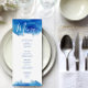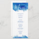Custom printed wedding menu cards with an abstract blue watercolor border to coordinate with our Sapphire Tide collection. Customize the text with your wedding menu options. Use the design tools to edit the fonts and colors or move text around to fit your menu selections. This ocean-inspired design is perfect for a destination wedding on the beach!
