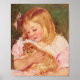 Sara Holding a Cat (1908) by American impressionist artist Mary Cassatt. Original fine art painting depicts a portrait of a little girl wearing a pink dress and holding a kitten.