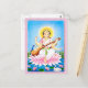 Saraswati sitting on pink lotus flower playing her instrument with her peacock sitting nearby. Very bright and colorful design that will get lots of attention. An eye-catching beauty.