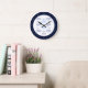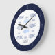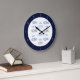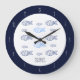Modern kitchen wall clock featuring hand-drawn sardines in blue and deep navy line art on a clean white background. The dark navy circular frame adds structure and contrast, while the simple “SARDINES” text keeps the design bold and graphic.