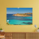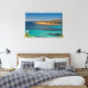 A beautiful canvas print featuring an original photograph of the ultra-transparent crystalline water of the Sardinian clear blue sea in all shades of turquoise, surrounded by green Mediterranean scrub with a little islet and some boats in the distance on a sunny summer day.