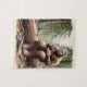 Sasquatch in mossy forest with a cheesecake jigsaw puzzle