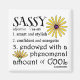 Defining Sassy in its true form for an awesome female. Everything about this image has spunk, from the bold fonts to the brightly colored daisies. The definition goes like this; 1. smart and stylish, 2. confident and energetic, 3. (most important of all) endowed with a phenomenal amount of COOL! If you know of a truly sassy women or girl this would definitely be for her. YOU GO GIRL!