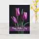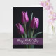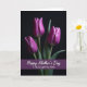 This card features a tall, vertical layout with three closed flower buds in rich magenta rising from a deep black background, their edges softly lit from the left like a quiet spotlight. The petals show fine, shiny lines that catch the light, giving the blooms a gentle, affectionate presence, as if they’re leaning toward one another in a close trio ❤️. Slender green stems hold each bud, with small touches of dark green leaves tucked into the shadows for a natural contrast. The lighting shapes the petals with smooth highlights and deep shade, creating a calm, intimate mood without needing extra decoration. Along the lower portion, a wide horizontal band of deep purple stretches across the card, grounding the floral scene. Centered on that purple band is a short message in white, flowing lettering that stands out clearly against the darker color 🌼. The overall palette stays focused on magenta, black, green, and purple, keeping the attention on the blossoms. The three buds sit near the upper half of the design, with their stems leading the eye down toward the purple band and its white text.