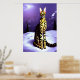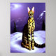 A large Savannah cat sitting in the snow in the mountain at night. This is a AI generated art.