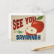 A charming Savannah Georgia vintage travel postcard featuring a lovely red apple, along with fun retro style text that says, "See you in Savannah"