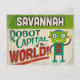 A funny Savannah Georgia vintage travel postcard featuring a friendly robot with fun retro style text that says, "Savannah, Robot Capital of the world!"