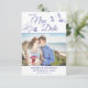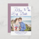 Elegant and romantic Save The New Date - wedding postponement photo card, featuring a beautiful and delicate periwinkle purple orchids floral line drawing on the upper part, over a white background. Easily personalizable by adding one of your favorite engagement horizontal pictures, and by editing the template fields on the lower band with your names, date, and location in a modern and simple purple all-caps font.