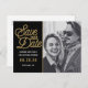 Nontraditional Save our Date Wedding postcard has a modern gold script against a black background. Your black and white photo is complimented with this bold announcement.