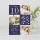 This modern and simple Wedding Save the Date card is perfect for the contemporary and trendy event. The design includes three feature photos of the lovely couple, a large date highlight, and the phrase, "Save Our Date," alternating in a signature handwritten script and unique serif font. On the back is a pinstripe border and features a couple-monogram. The color scheme is minimalist in navy blue and white. It's elegant, unique, trendy, bold, and classic; the perfect design to impress your guests.