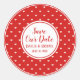 Add a splash of color to your Save the Date Envelope with this red and white envelope seal. Save the Date, your names and wedding date is written in the center of a white circle ringed in red. The outer ring is made up of tiny white hearts on red. Easy to customize.