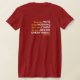 My overall review is that the T-shirt is nice, it fits true to size however the font is significantly smaller than advertised and you can't read it. The printing is unreadable and there is a strain to read it. It does not look like the advertised product. Maybe the shirt color is darker or a larger more visible font should have been used. Photos with and without flash and font is barely legible.