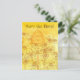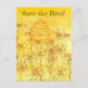 A postcard to send a "save the bees" message decorated with honeybees flying around a vintage bee skep in a field of wildflowers illustrated with sepia ink on a warm honey yellow watercolor wash background. Great for postcard exchanges!