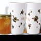 Tall white latte mug with bumblebees design. "Save the Bees" sample wording is slightly angled in the center of the design, which is made up of fuzzy bees of all sizes.