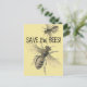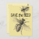 This postcard shows honey bees on the front along with the message "Save the Bees". Honey bees are disappearing at an alarming rate. This is important because bees are responsible for pollinating a major portion of crops around the world. The side for writing is decorated with a small bee and a yellow tint.