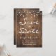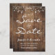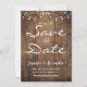 Wedding save the date card with wood background and fairy lights. Type your own text over sample text.