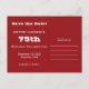 A photograph of a bright yellow railroad train decorates this unique and fun 75th Birthday "Save the Date" postcard. The reverse has white lettering on a red background. You can easily change the text for name, age, event, date, etc. Be sure to change #Years on photo side, too. Matching postage stamp for postcards is zazzle product 172423296315787132. Original photograph by Marcia Socolik. All Rights Reserved © 2014 Alan & Marcia Socolik.