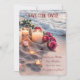 Coastal themed with roses and candles on a white sandy beach by the ocean. A beautiful way to have friends and family save your important date.