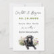 Save the date wedding announcements with black lab design. White paper with black, modern fonts. First names of the couple at the top with numeric date in spring green color. The numbers have a darker shadow color. Also include the location (ex. city and state) of the event. A black Labrador retriever lies among a patch of wildflowers in the design at the bottom of the paper. Reverse is blank. These save the date cards are also downloadable.