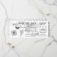 Boarding pass wedding save the date ticket invitation featuring a elegant silver foil destination world map, compass, airplane, and a personalized text template.