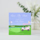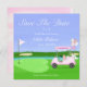 This golf-themed bridal shower save the date is crafted with the bride-to-be at the heart of its design. It features a heart-shaped putting green and a flag pin fluttering in the breeze, emblazoned with the words "Bride to Be." The golf cart is festively adorned with champagne, gifts, a tiara, and an intricately illustrated bridal shower cake. A bridal veil elegantly drapes from the golf bag, adding a charming touch. Designed by Daphsam, this one-of-a-kind save the date comes with an easy-to-use template to ensure stress-free planning.