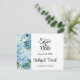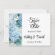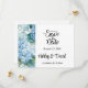 Save the Date Card is shown in a classic formal layout in the color white with Black text and script text highlighting the Bride and Groom names and accented with a hydrangea flowers print.
