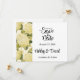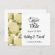 Save the Date Card is shown in a classic formal layout in the color white with Black text and script text highlighting the Bride and Groom names and accented with a lovely light-yellow hydrangea flowers print.