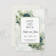 Save the Date card, wedding invitation, floral blue and green bouquet watercolor tones pastel colors classy