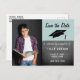 Save the Date Chalkboard Boy`s Photo Graduation Announcement Postcard. Modern save the date postcard for announcing the graduation party for a graduate. The background is blue and trendy chalkboard texture and includes a graduation cap. The design has trendy text - customize all the text on the card with your data, and insert the graduate`s photo into the template. The backside includes a custom return address.