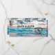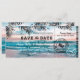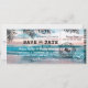 Beach destination save the date boarding pass with a tropical palm beach setting, string twinkle lights, and a modern couples shower template.