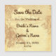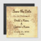 A custom Save the Date magnet card with retro script and serif letters in brown on a vintage etching of palm trees on a sandy beach and beautiful clouds over calm ocean waves in light brown on a faux parchment background.