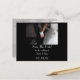 Save The Date postcard. A romantic and elegant wedding notification with a photograph of a couple holding hands. The photograph focuses on the couples arms and hands clasped together, while wearing their fancy wedding attire. She in her wedding gown and he in his tux.