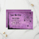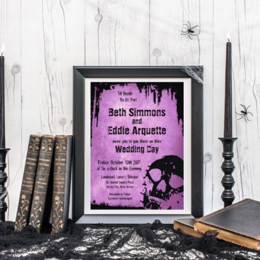Save the Date for a Halloween Wedding with Spiders and Web over a purple background and a black grunge frame. You can change the fonts, add or delete text. You can move or change the size of the spiders and web. There are matching Halloween Wedding options in my store. This can also be used for a Halloween Party.