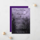A custom wedding or party Save the Date card with a background of a spooky sky with a purple mist, leafless trees along a dark haunted road, gothic ravens and a cloudy full moon.