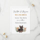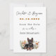 Wedding save the date announcements with German Shepherd dog design. The puppy lies among wildflowers in the design at the bottom of white paper. Black text is used in script and printed fonts, except for the date which is rust orange.