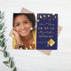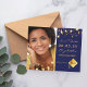 On front: Add your own vertical size photo of the graduate. A chic navy blue background color, decorated with faux gold stars. Personalize and add a name and date. Golden letters. The name and the text: Save the Date are written with a modern hand lettered style script.
