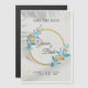A graceful Save the Date design featuring a gold circular frame with soft beige roses and delicate blue leaves. The clean background and classic typography create a timeless, elegant look