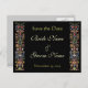 A custom Save the Date postcard with beautiful gothic illuminated manuscript art of flowers and scrolling leaves on a black background.