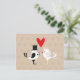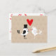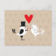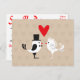This charming wedding postcard features bride and groom Lovebirds throwing red heart kisses highlighted against a tan heart background. The back of the postcard can be fully personalized with names of the bride and groom, wedding date, and location.