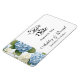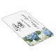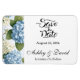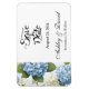 Save the Date Magnet is shown in a classic formal layout in the color white with Black text and script text highlighting the Bride and Groom names and accented with a hydrangea flowers print.