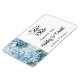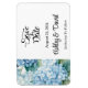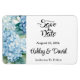 Save the Date magnet is shown in a classic formal layout in the color white with Black text and script text highlighting the Bride and Groom names and accented with a hydrangea flowers print.
